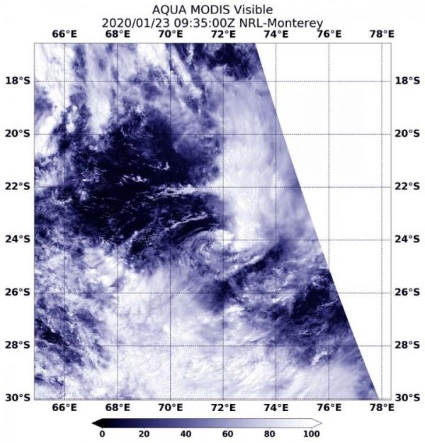 Image: On Jan. 23, 2020 at 4:35 a.m., EST (0935 UTC) the MODIS instrument that flies aboard NASA's Aqua satellite provided a visible image of Tropical Storm 09S in the Southern Indian Ocean. (Credit: NASA Worldview)