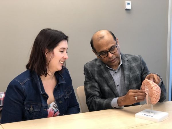 Image: Dr. Raj Ramasubbu shows study participant Beth MacKay where the stimulation device was implanted in her brain. (Credit: Photo by Kelly Johnston, Cumming School of Medicine)