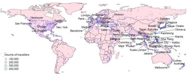 Image: Global cities receiving airline travellers from 18 high-risk cities in mainland China over three month period. (Credit: WorldPop)