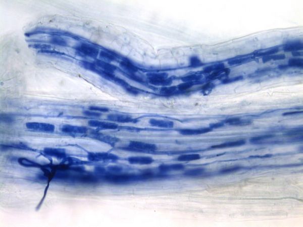 Photo Credit: Blue-stained filaments of arbuscular mycorrhizal fungus, which lives in symbiosis with plants, inhabit plant roots in this microscope image (Photo by Ashley Finnestad, T.E. Cheeke Lab, WSU).
