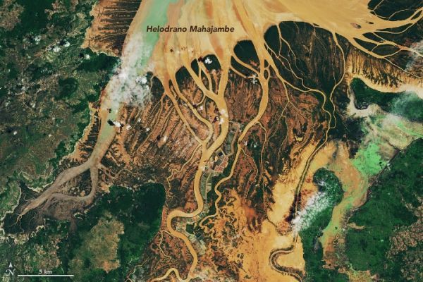On January 27, 2020, the Operational Land Imager (OLI) on Landsat 8 captured natural-color images of sediment-filled rivers swollen out of their banks and pouring their outflow into Helodrano Mahajambe (Mahajambe Bay) in northwestern Madagascar. For comparison, the second image in each pair shows the same area under more typical seasonal conditions on January 18, 2017.
