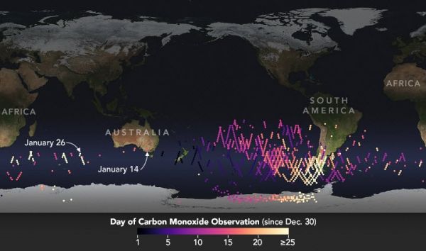 During the past few weeks, satellite sensors have collected data that is even more stunning than the images. The Microwave Limb Sounder (MLS) on NASA's Aura satellite has collected preliminary data that suggests the Australian fires injected more carbon monoxide into the stratosphere in the month of January than any other event the sensor has observed outside of the tropics during its 15-year mission. The fires appear to have produced about three times as much of the poisonous, colorless gas as major fires in British Columbia in 2017 and Australia in 2009. (Fires in Indonesia in 2015-16 may have delivered as much or more, but those fires happened over a longer period.)