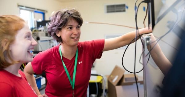 Image: HOMEChem lead researcher Delphine Farmer, right, and graduate student Erin Boedicker, look at a droplet-measurement instrument. (Credit: Callie Richmond)