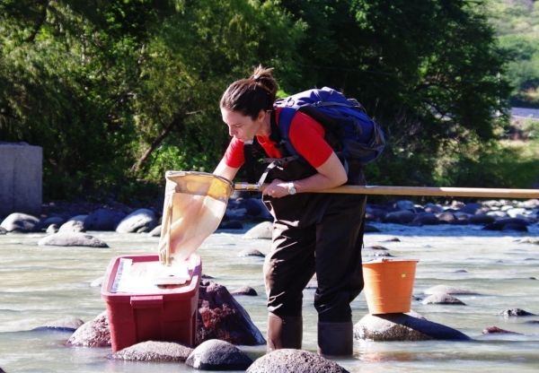 Image: Sally Entrekin samples a stream in search of aquatic insects, including mayfly nymphs. (Credit: Virginia Tech)