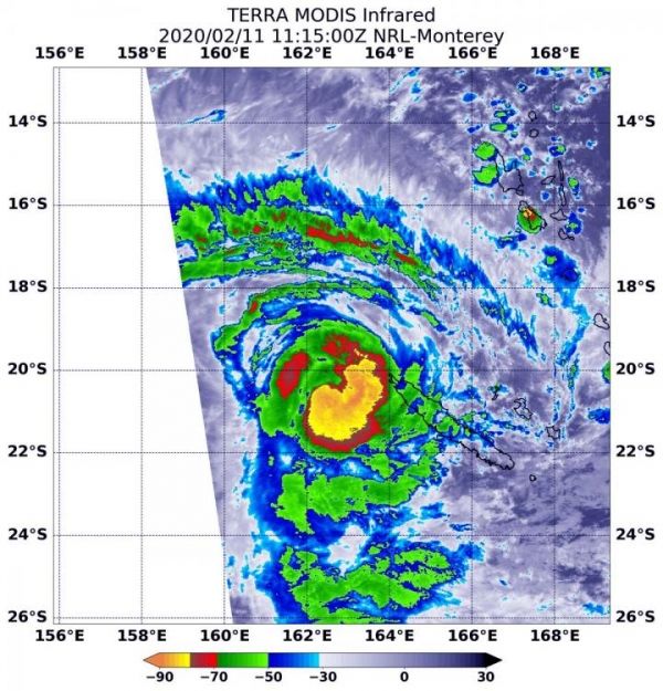 Infrared data provides temperature information, and identifies the strongest thunderstorms that reach high into the atmosphere and have the coldest cloud top temperatures. On Feb. 11 at 6:15 a.m. EST (1115 UTC), the Moderate Resolution Imaging Spectroradiometer or MODIS instrument aboard NASA’s Terra satellite gathered that temperature information about Uesi’s cloud tops. MODIS found powerful thunderstorms south and east of the center of circulation where temperatures were as cold as or colder than minus 80 degrees Fahrenheit (minus 62.2 Celsius). Cloud top temperatures that cold indicate strong storms with the potential to generate heavy rainfall.