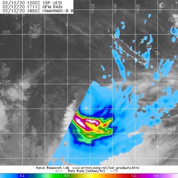 The GPM’s core satellite passed over Uesi on Feb. 12 at 12:11 p.m. EST (1711 UTC). GPM found heaviest rainfall southwest of the center, falling at a rate of 1.6 inches (40 mm) per hour. Directly south of the center were areas where rainfall rates were falling at a rate of 1 inch (25 mm) per hour. Scattered light rain, falling at less than 0.2 inches (less than 5 millimeters) per hour appeared to be occurring in the rest of the storm.