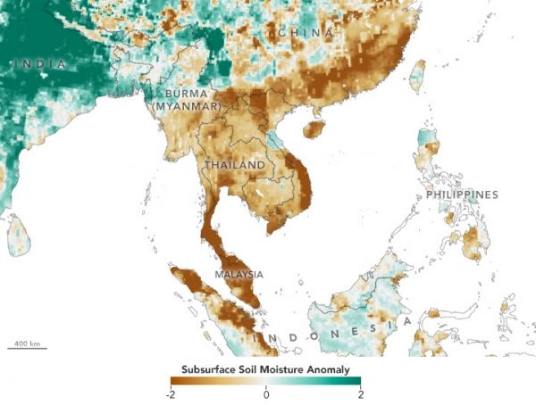 The map above shows soil moisture anomalies, or how much the water content near the land surface was above or below the norm for southeast Asia from January 1 to February 7, 2020. The measurements were derived from data collected by the Soil Moisture Active Passive (SMAP) mission, the first NASA satellite dedicated to measuring the water content of soils. SMAP’s radiometer can detect water in the top 5 centimeters (2 inches) of the ground. Scientists use that surface layer data in a hydrologic model to estimate how much water is present even deeper in the root zone, which is important for agriculture.