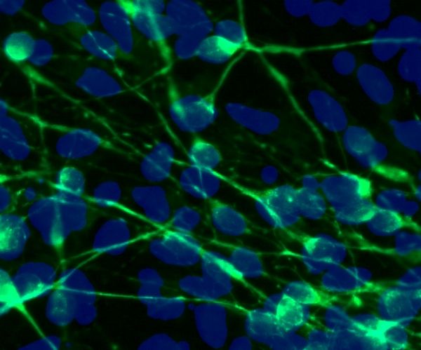 Image: Healthy CA3 pyramidal neurons stained to show the cell body (blue) and axons (green). CREDIT: Credit: Salk Institute