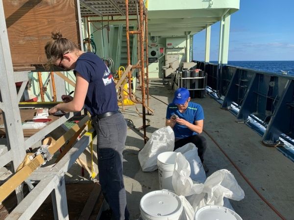 Image: Cécile Prigent (left), a postdoctoral researcher at UD, and Kuan-Yu Lin, a doctoral student, sort and label rocks on the deck of the research vessel. CREDIT: University Of Delaware