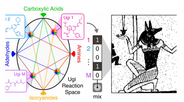 In a study published in Nature Communications, the team stored a variety of image files — a Picasso drawing, an image of the Egyptian god Anubis and others — in arrays of mixtures containing custom-synthesized small molecules. In all, the researchers stored more than 200 kilobytes of data, which they say is the most stored to date using small molecules. That’s not a lot of data compared to traditional means of storage, but it is significant progress in terms of small molecule storage, the researchers say.