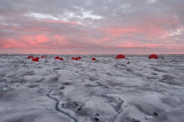 Image: Black and Bloom field camp established on the surface of the Greenland Ice Sheet approximately 35km inland from the southwestern ice sheet margin. Note the discoloured (dark) ice in the image driven by biological communities. Large dome tents are the science and mess tent, with smaller tents the personal tents for team members who spent around four weeks camping on the ice in 2016 and 2017. (Credit: Dr Jenine McCutcheon)