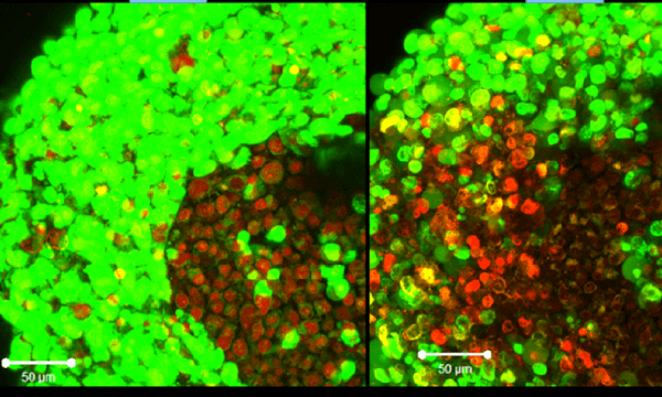 Image: Image of tumour model showing live cells in green and dead cells in red. Image on the left is before PDT and right is after. CREDIT: University Of Sheffield