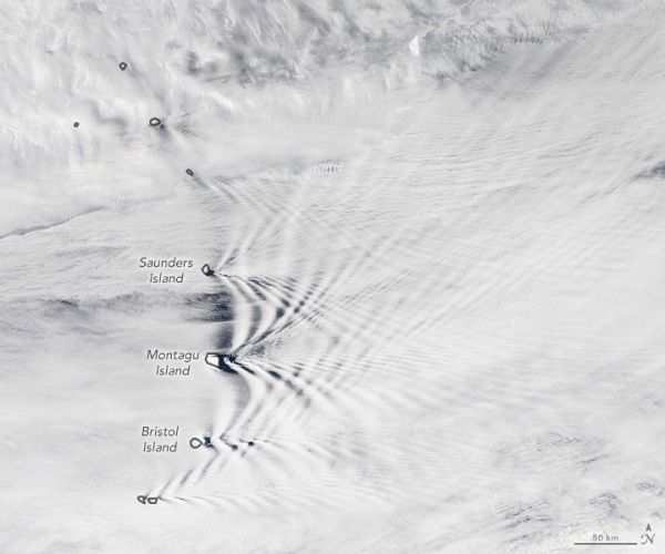 As shown by this natural-color satellite image, that was enough height to disrupt air masses flowing around the islands and to create an interlocking series of mountain-wave clouds. The image was acquired by the Moderate Resolution Imaging Spectroradiometer (MODIS) on NASA’s Terra satellite around 11 a.m. local time on February 5, 2020, as westerly winds blew over the islands.
