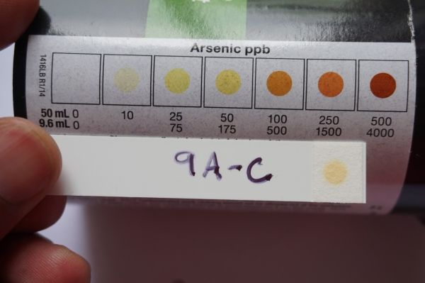 Photo: After a series of steps with different chemical reagents, the color that develops on a test strip is compared to a reference chart provided by the kit manufacturer. A darker color indicates a higher concentration of arsenic in the water sample. Photo credit: R. Reddy