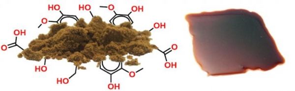 Image: Lignin is a promising raw material (left) for thermoplast (right) production. (Credit: KTH Stockholm, Marcus Jawerth)