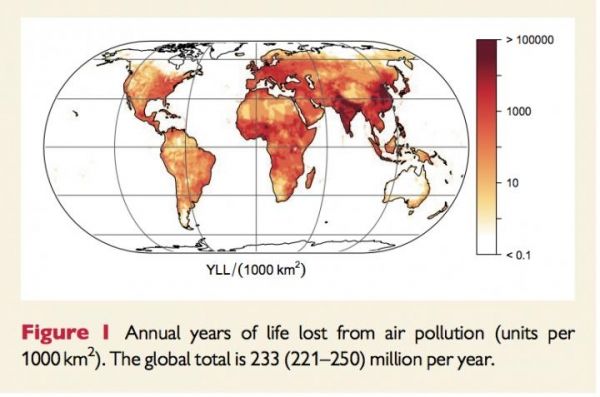 Image: Heat map showing years of life lost each year from air pollution. (Credit: Cardiovascular Research)