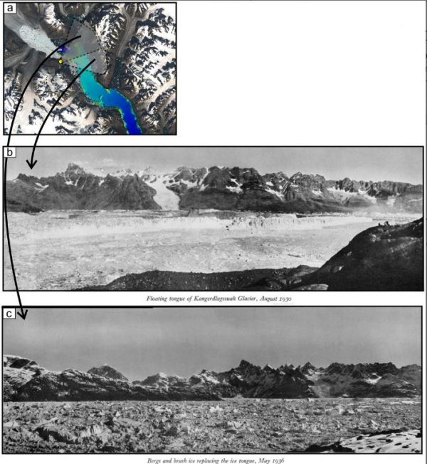 The only reason scientists today know about the Kangerlussuaq Glacier’s dramatic retreat in the 1930s is the existence of both aerial and ground-level photos taken by explorers before and after the glacier’s tongue had dislodged itself from a submarine ridge. The ridge had pinned the glacier in place, perhaps making the glacier relatively more stable than many other coastal Greenland glaciers.