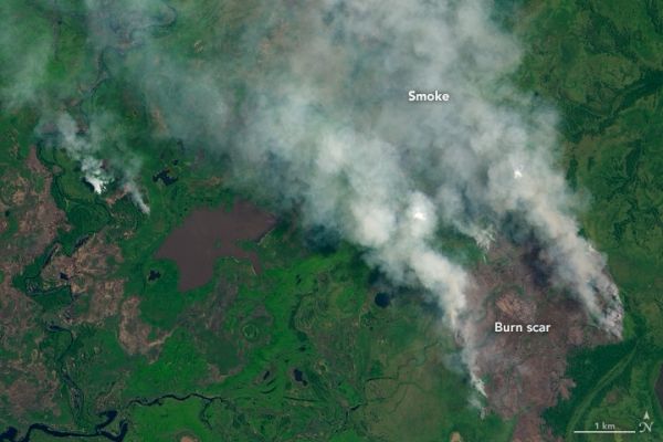 The Operational Land Imager (OLI) on Landsat 8 acquired a more detailed image (below) of the fire on March 4, 2020. As seen from a wider perspective (third image), the fire was burning just north of wetlands near the São Lourenço River.