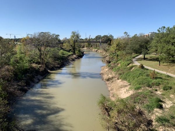One bayou meanders toward downtown Houston. The other runs in parallel to the south, much of it through a concrete channel.