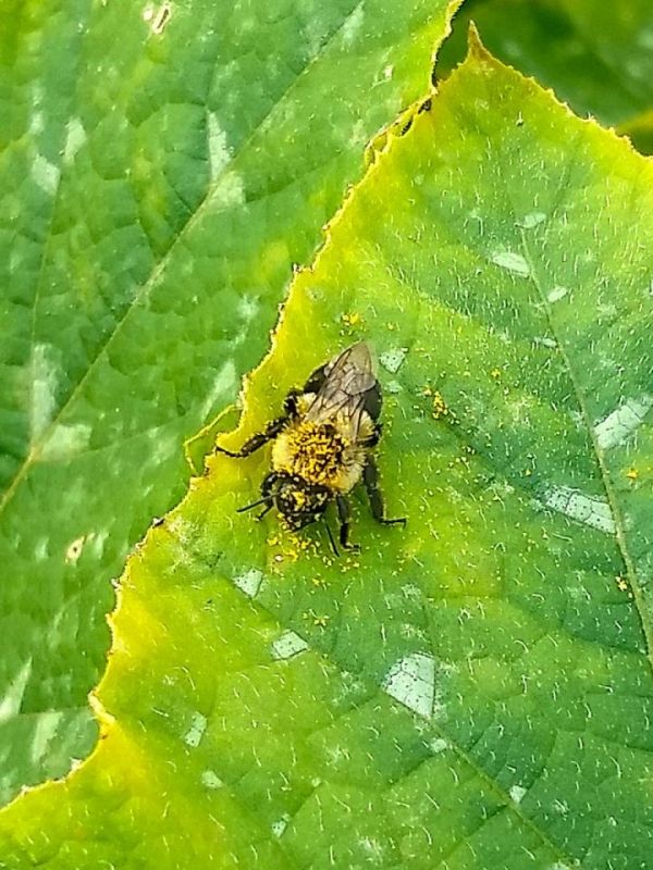Image: A bumblebee on a leaf leaves a trail of cucurbit pollen behind her as she tries to remove it. (Credit: Kristen Brochu, Cornell University)