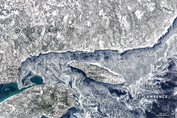 On March 9, 2020, the Moderate Resolution Imaging Spectroradiometer (MODIS) on NASA’s Aqua satellite acquired this image of sea ice and eddies in the northwestern Gulf of St. Lawrence. The ice was thin enough at the time to be moved around by winds and currents, forming delicate patterns around Anticosti Island in Quebec, Canada.
