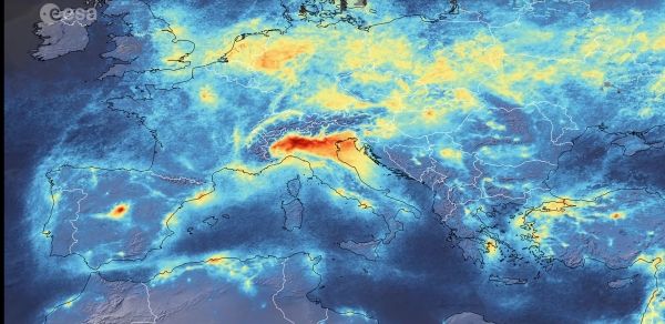 Claus Zehner, ESA’s Copernicus Sentinel-5P mission manager, comments, “The decline in nitrogen dioxide emissions over the Po Valley in northern Italy is particularly evident.