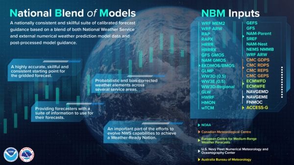 The NBM is a nationally consistent suite of calibrated forecast guidance based on a blend of both NWS and non-NWS model output. On February 19, 2020, the latest version of the National Blend of Models (NBM), version 3.2, went operational to NWS meteorologists around the country! The goal of the NBM is to create a highly accurate, skillful, and consistent starting point for forecasts and is a foundational component in evolving NWS capabilities to achieve a Weather-Ready Nation.