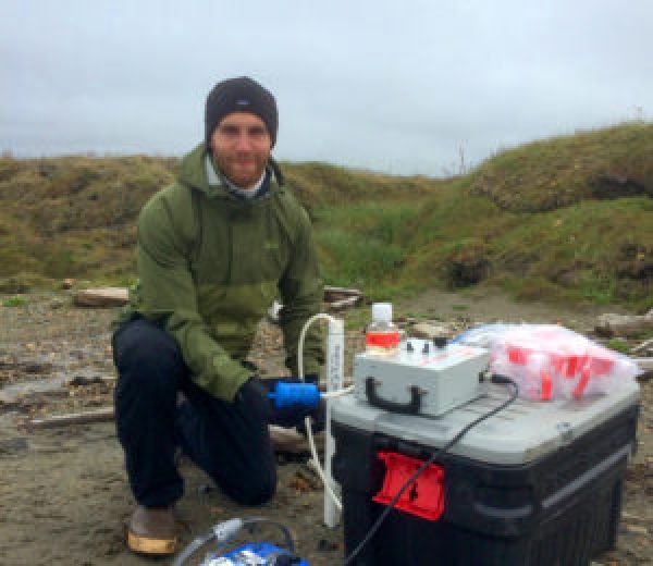 Image: Dr. Craig Connolly takes a groundwater sample to measure the concentration and age of organic carbon and nitrogen in groundwater flowing beneath the beach. Credit: Jim McClelland / University of Texas at Austin.