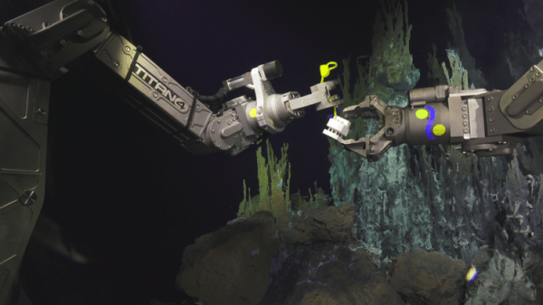 Image: The SPME sampler being held by a remotely operated vehicle at the underwater sampling location in the South Pacific Ocean. Image credit: NOAA and Schmidt Ocean Institute.