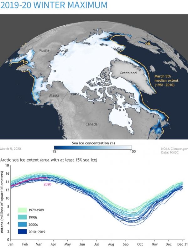 On March 24, the National Snow and Ice Data Center (NSIDC) reported that the 2019–2020 growth season had an unexceptional finish: 5.81 million square miles (15.05 million square kilometers). It was the 11th-lowest maximum in the 42-year satellite record.