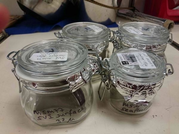 Photo: Stainless steel filters stored in glass containers. (Photo Credit: Alfred-Wegener-Institut, Melanie Bergmann)
