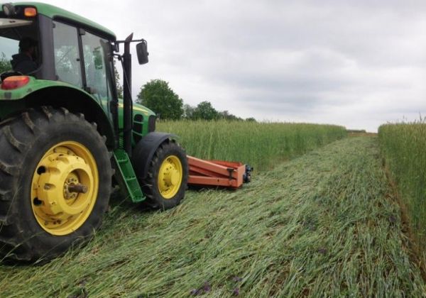 Image: Cereal rye shown here is being mechanically terminated with a roller-crimper in an organic no-till soybean system. Researchers compared tillage-based soybean production with reduced-tillage soybean production. (Credit: John Wallace/Penn State)