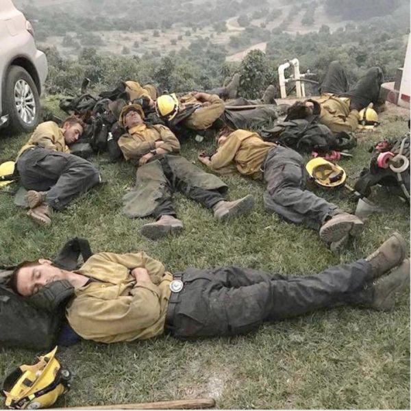 Image: Wildland firefighters in Kern County, California rest after working 24-hour shifts during the Thomas Fire of 2017. (Credit: Kern County Fire Department)