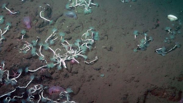 Image: Methane-consuming serpulid worms on the seafloor off the coast of Costa Rica. (Credit: Alvin/WHOI)
