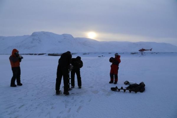Image: An ice auger is used to drill a borehole through the proglacial Isortoq River seasonal ice cover. (Credit: Lincoln Pitcher)