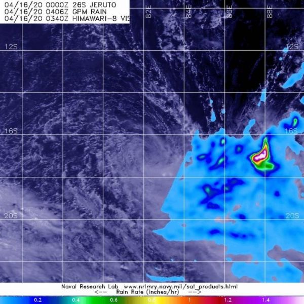 Image: The GPM core satellite passed over Tropical Storm Jeruto on April 16 at 12:06 a.m. EDT (0406 UTC). Winds pushed the heaviest rainfall (pink) east of the center, where it was falling at a rate of 1.6 inches (40 mm) per hour in a small area. (Credit: NASA/JAXA/NRL)