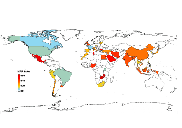 Image: Map showing multi-antibiotic resistance worldwide. CREDIT: Miriam Reverter et al., Nature Communications.