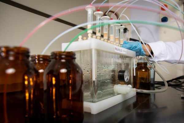 Image: To study pharmaceuticals in water, UB scientists used the system pictured to isolate chemical compounds from water samples. (Credit: Meredith Forrest Kulwicki)