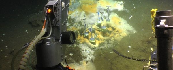 Image: Diving in the Gulf of Mexico: With the submersible ALVIN, the researchers from Bremen were able to reach the seafloor. There they used ALVIN's grab arm to collect sediment cores from the seabed. White orange coloured microbial mats made of sulfur-oxidizing bacteria indicate hot vents, where particularly large amounts of methane and other energy-rich compounds are released. CREDIT: Woods Hole Oceanographic Institution