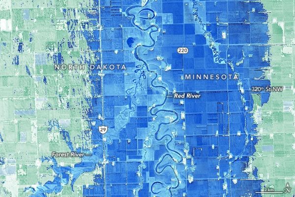 On April 17, 2020, the Operational Land Imager (OLI) on Landsat 8 acquired this image of flooded farmland along the river in Marshall County, Minnesota, and Walsh County, North Dakota. At the time, a stream gauge at Drayton, North Dakota, recorded water levels of 43 feet (13 meters), just high enough to be classified as major flooding. The second image shows the same area in May 2015, when water levels were lower.