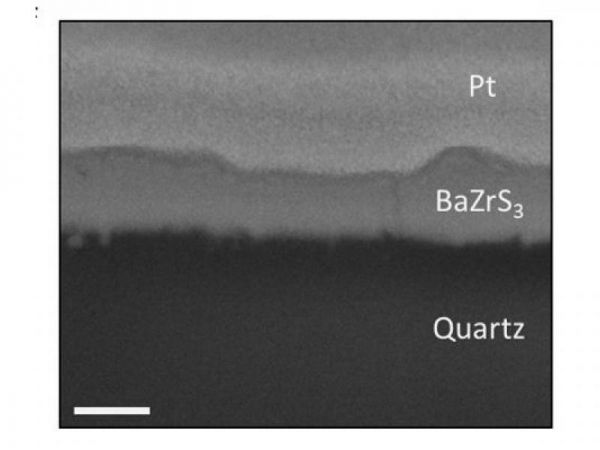 Image: Scanning electron microscopy image of a BaZrS3 film deposited on quartz. Rensselaer Polytechnic Institute
