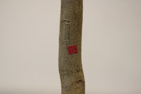 Image: A microinjection device (red) is attached to a citrus tree, providing a way of injecting pesticide or other materials directly into the plant's circulatory system. CREDIT: Courtesy of the researchers