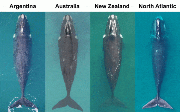 Since large-scale commercial whaling stopped in the last century, most populations of southern right whales have recovered well, and now there are about 10,000 - 15,000 right whales in the southern hemisphere. Unfortunately, the same cannot be said for the North Atlantic right whales, found today off the east coast of North America. There are only around 410 individuals left, and the species is heading to extinction.