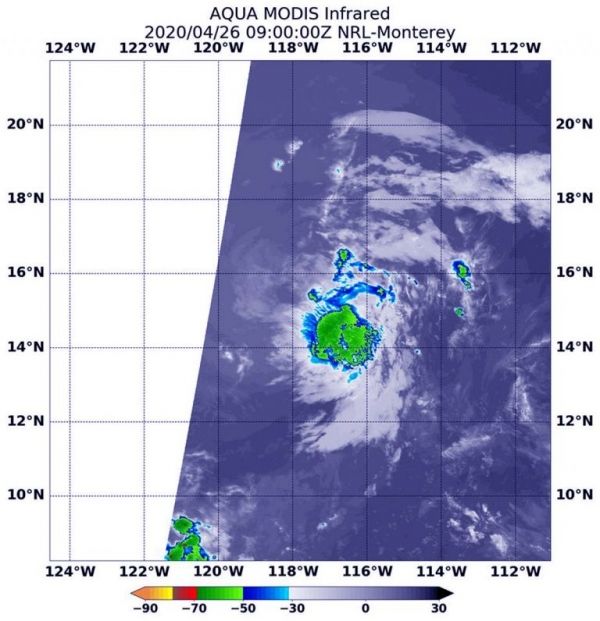 NASA’s Aqua satellite passed over Tropical Depression 1E on Sunday, April 26, 2020 at 5 a.m. EDT (0900 UTC) and the Moderate Resolution Imaging Spectroradiometer or MODIS instrument aboard analyzed 1E in infrared light. Infrared light is used to determine temperature of cloud tops in storms, and the colder the cloud top, the higher it is in the troposphere (lowest layer of the atmosphere), and the stronger the storm tends to be. MODIS found cloud top temperatures as cold as minus 50 degrees Fahrenheit in the depression, not cold enough to suggest heavy rainfall.