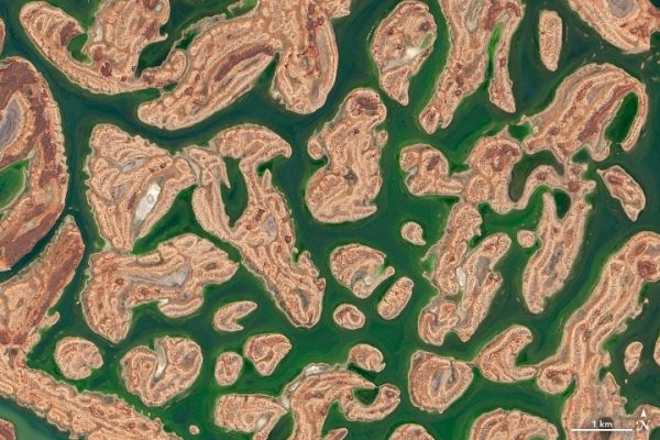 Located in the Shire of Wiluna in Western Australia, Lake Carnegie is one the country’s largest lakes. When full, it is covers about 5,700 square kilometers (2,200 square miles). In dry years, the lake is mostly a muddy marsh. The images on this page show the lake on March 26, 2020, when it was still partially filled. The images were acquired by the Operational Land Imager (OLI) on Landsat 8.