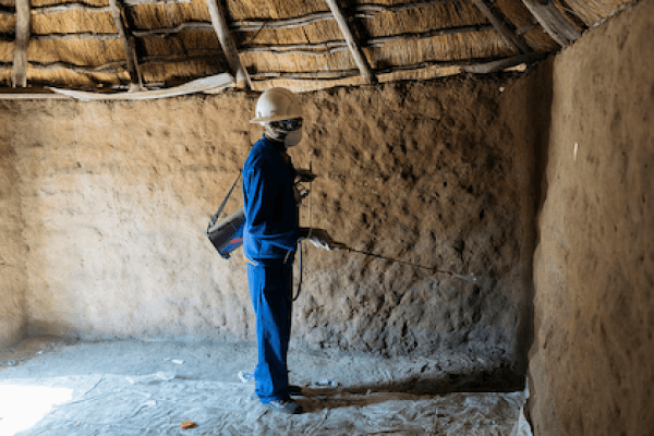 Image: A sprayer applies one of the study interventions, reactive focal vector control (RAVC) with pirimiphos-methyl insecticide, on indoor walls of sleeping structures, to repel and kill mosquitoes in a Zambezi village in 2017. CREDIT: UT Southwestern Medical Center