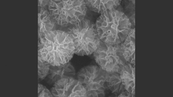 Image: Scanning Electron Microscopy (SEM) images of the porous silica nanodevices. The exposed amount of surface area provides high opportunity to attach the peptide-attracting antibody fragments. (Image by Center for Nanoscale Materials, Argonne National Laboratory.)