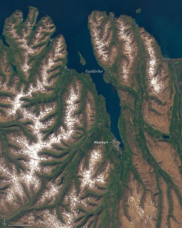Eyjafjörður spans more than 60 kilometers (40 miles) from its mouth to Akureyri, a city known as Iceland’s “northern capital.” The Operational Land Imager (OLI) on Landsat 8 acquired this image of the fjord on July 26, 2017.