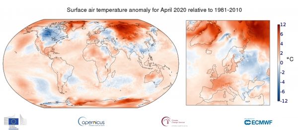 Globally, April 2020 was on a par with the previous warmest April on record (April 2016), with temperatures particularly above average over northern and central Eurasia, parts of Greenland and Antarctica, but markedly below average over large parts of North America. In Europe, temperatures were well above average in a number of western countries, but below average in the northeast.