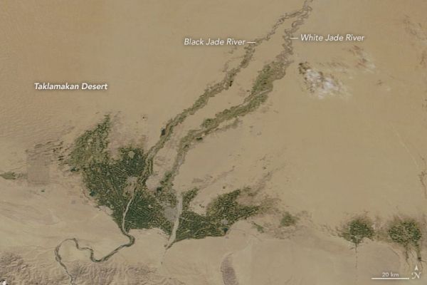 But even in this dry, dangerous desert nicknamed the “Sea of Death,” plant life sprouts in the springtime. The images above show a portion of the Taklamakan Desert by the oasis town of Hotan on February 23 and April 29, 2020, as vegetation sprouted on the landscape. The images were acquired by the Moderate Resolution Imaging Spectrometer (MODIS) on NASA’s Terra satellite.